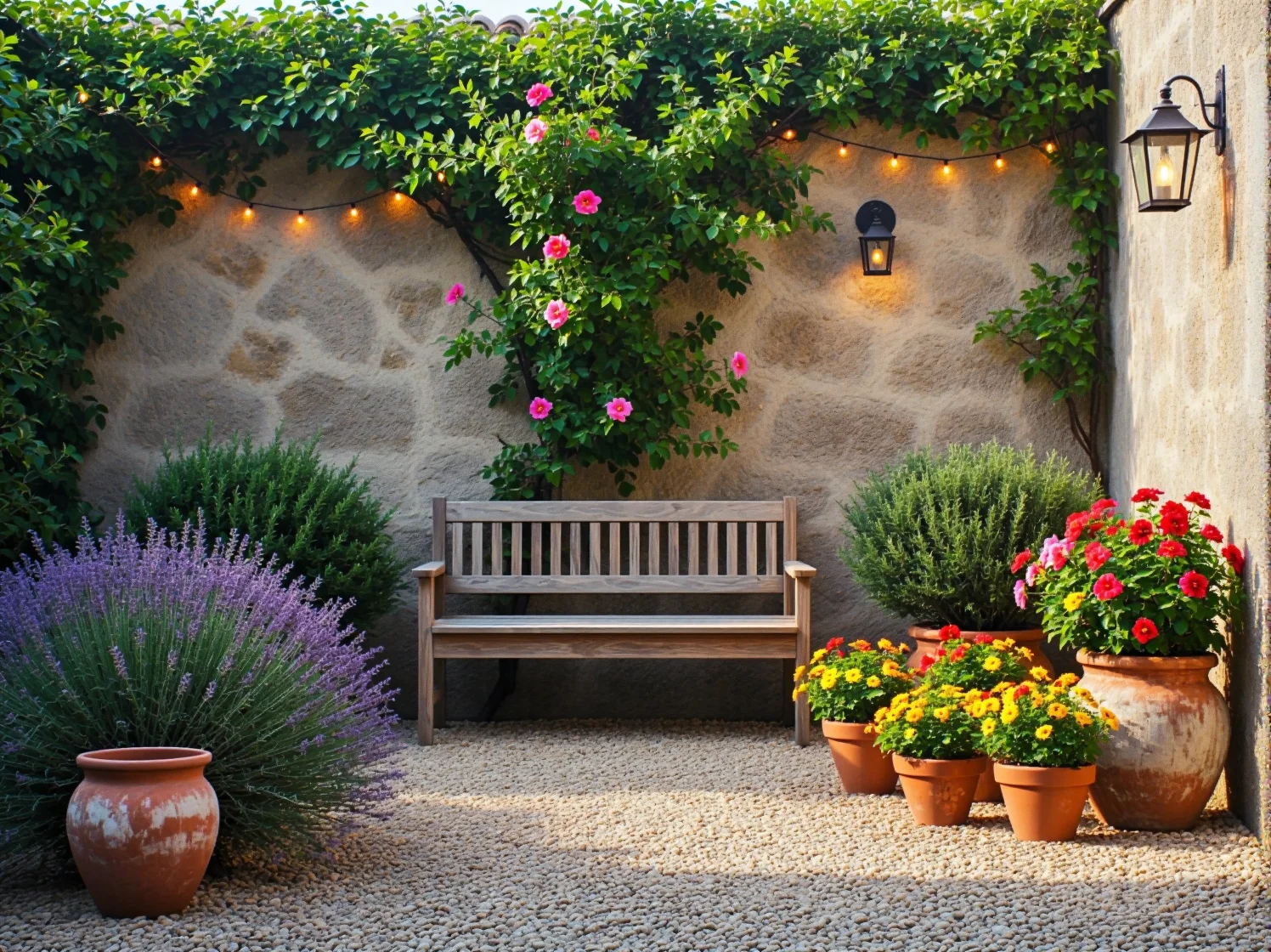 - Roślinność: Lawenda, szałwia, rozmaryn, oliwki (lub ich zamienniki w naszym klimacie, jak oliwnik wąskolistny), pnące róże i glicynie.
