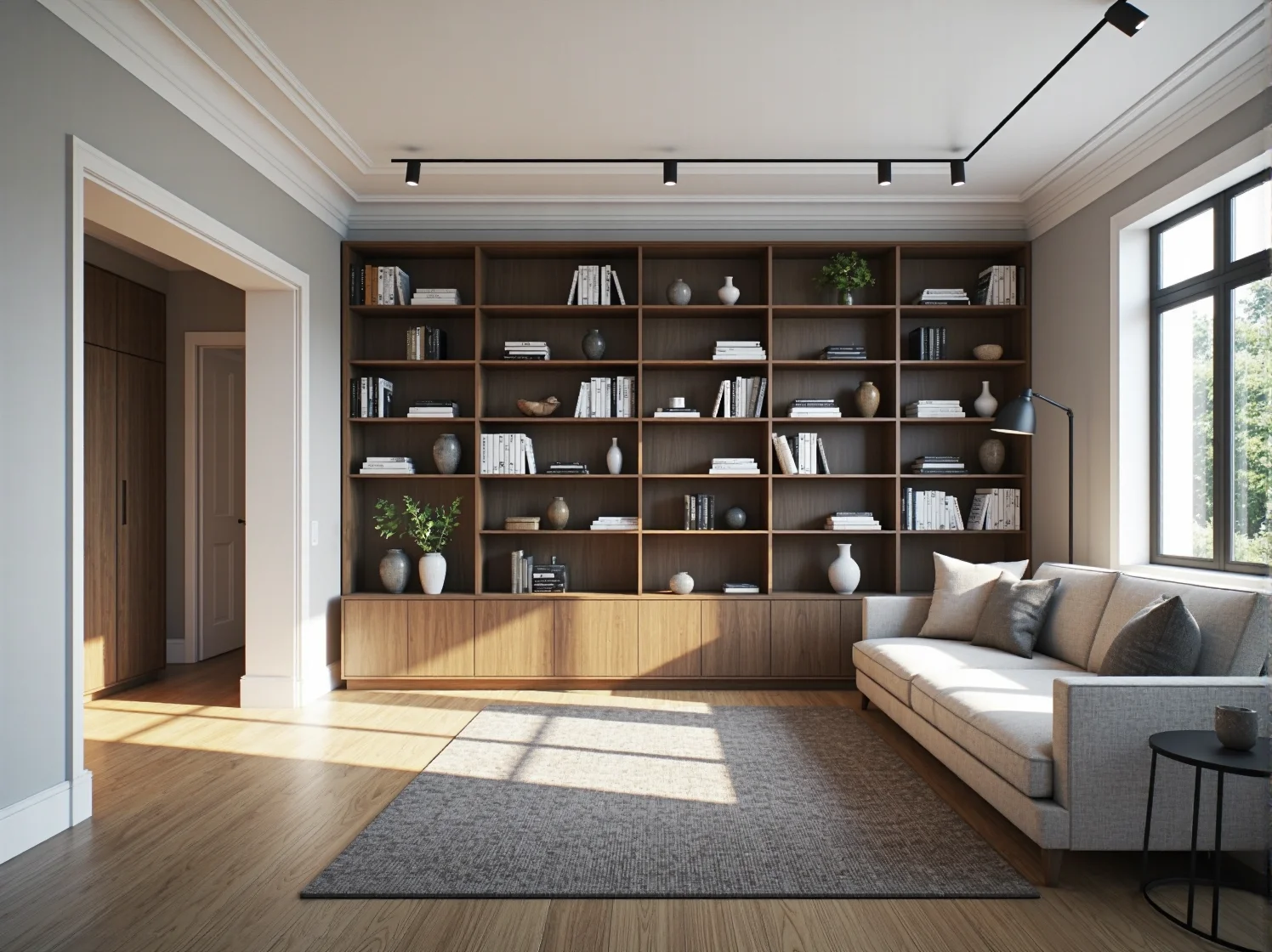 • Element kompozycyjny: Dobrze dobrany regał może wizualnie „zamknąć” i uporządkować kompozycję wnętrza, dodając mu głębi i sprawiając, że staje się ono bardziej spójne.