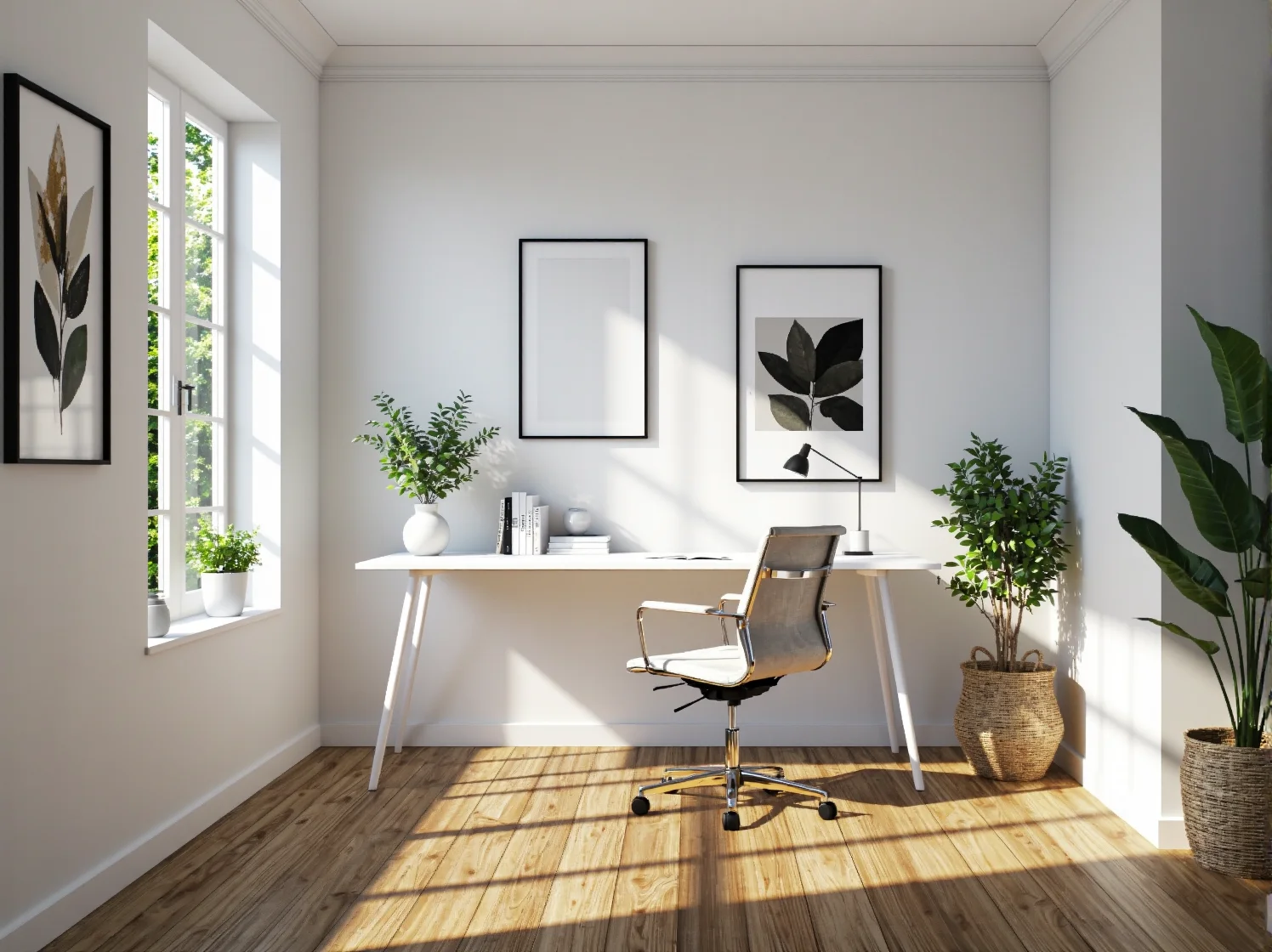 Idealna sytuacja to wydzielenie na biuro osobnego pokoju. Jeśli jednak nie dysponujesz dodatkowym pomieszczeniem, nic straconego. Styl skandynawski świetnie sprawdza się w anektowaniu części salonu czy sypialni. Wybierz miejsce blisko okna, aby zapewnić sobie jak najwięcej dziennego światła. Jasna, dobrze oświetlona przestrzeń pozytywnie wpływa na nastrój i zmniejsza zmęczenie oczu. Ściany pomaluj na biało lub w odcieniach złamanej bieli, jasnej szarości czy chłodnego beżu. Taka baza stanowić będzie idealne tło dla mebli i dodatków, a także optycznie powiększy wnętrze.