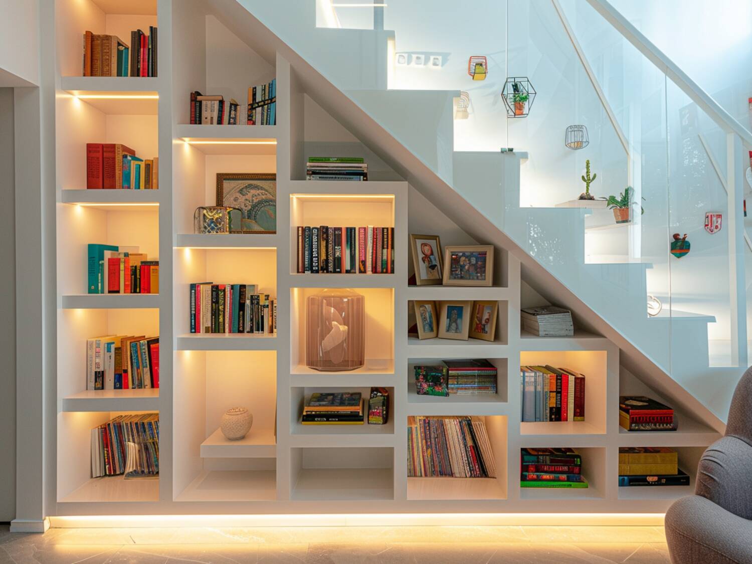 - Wykorzystuj przestrzeń pod meblami – np. pod łóżkiem lub kanapą można umieścić płaskie półki na książki.